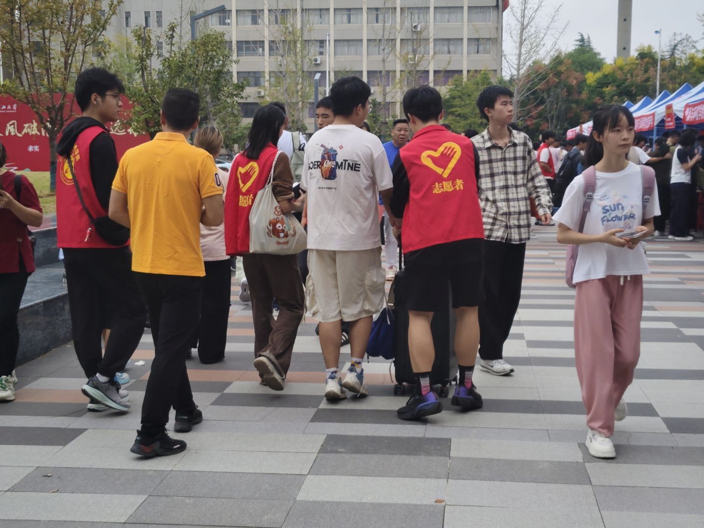 迎新现场报到日,人头攒动,气氛热烈而有序。在学院报到点,工作人员分工明确,信息核查、学籍核验、发放物资材料、领取军训物资等流程高效顺畅。身着统一服装的学生志愿者成为了校园里最亮丽的风景线,他们活跃在校门、报到处、宿舍楼等各个角落,热情地为新生搬运行李、指引道路、答疑解惑,用真诚的笑容和耐心的服务消除了新生初来乍到的陌生与不安,让他们第一时间感受到了学院大家庭的温暖与友爱。学校和学院领导也多次来到学院迎新报到处,了解现场报到情况,和新生及家长面对面交流。