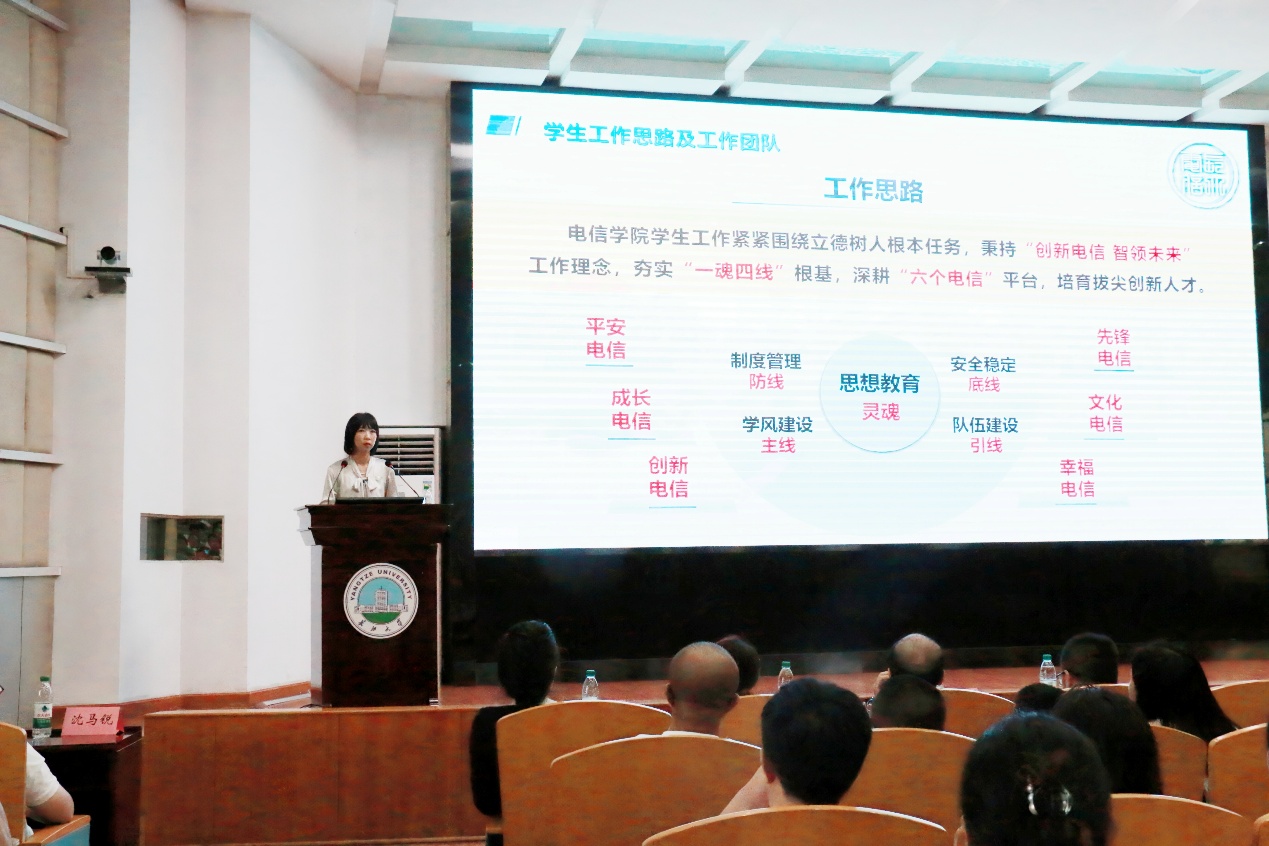 为增进新生家长对学院的了解,搭建家校沟通的桥梁,14日下午,学院隆重举行了2025级新生家长见面会,学院全体领导、班主任、辅导员参加活动。学院党委书记郭梅致欢迎词,对来自全国各地的同学和家长表示热烈欢迎,并对实现家校同心、协同育人提出了热切希望。院长罗明璋详细介绍了学院的发展历史、师资力量、学科特色、科研实力等内容,为同学们描绘了未来发展的灿烂前景。副院长蒋涛对人才培养和教学相关工作进行讲解,就毕业条件、学位授予、推免、课程考核、转专业等大家关心的问题进行了解答。党委副书记张晨露重点介绍了学院学生工作开展情况,对新生在校期间的教育管理工作提出要求。见面会现场气氛热烈,家校双方坦诚交流,共同表达了携手努力、促进学生全面发展的美好愿望,为新生今后的成长奠定了坚实的信任基础。