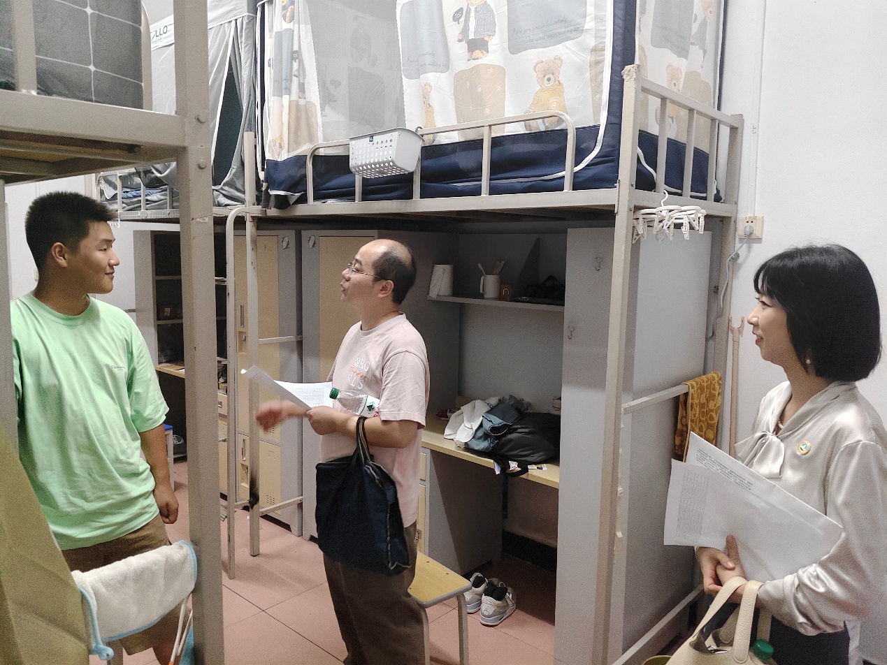 班会结束后,学院领导、班主任以及辅导员一行深入新生宿舍,走访慰问刚刚安顿下来的新同学。“家乡是哪里的?”“对学校的饮食和住宿还习惯吗?”“生活上有没有什么困难?”每到一个寝室,领导老师们都与新生进行亲切交谈,细致地了解他们的入住情况和生活需求,耐心解答同学们的各种问题,并叮嘱大家要尽快适应新环境,团结室友,注意人身和财产安全,以饱满的精神状态迎接接下来的军事训练和大学课程学习。亲切的问候和暖心的话语让新生们倍感温暖,纷纷感谢学院的关心。